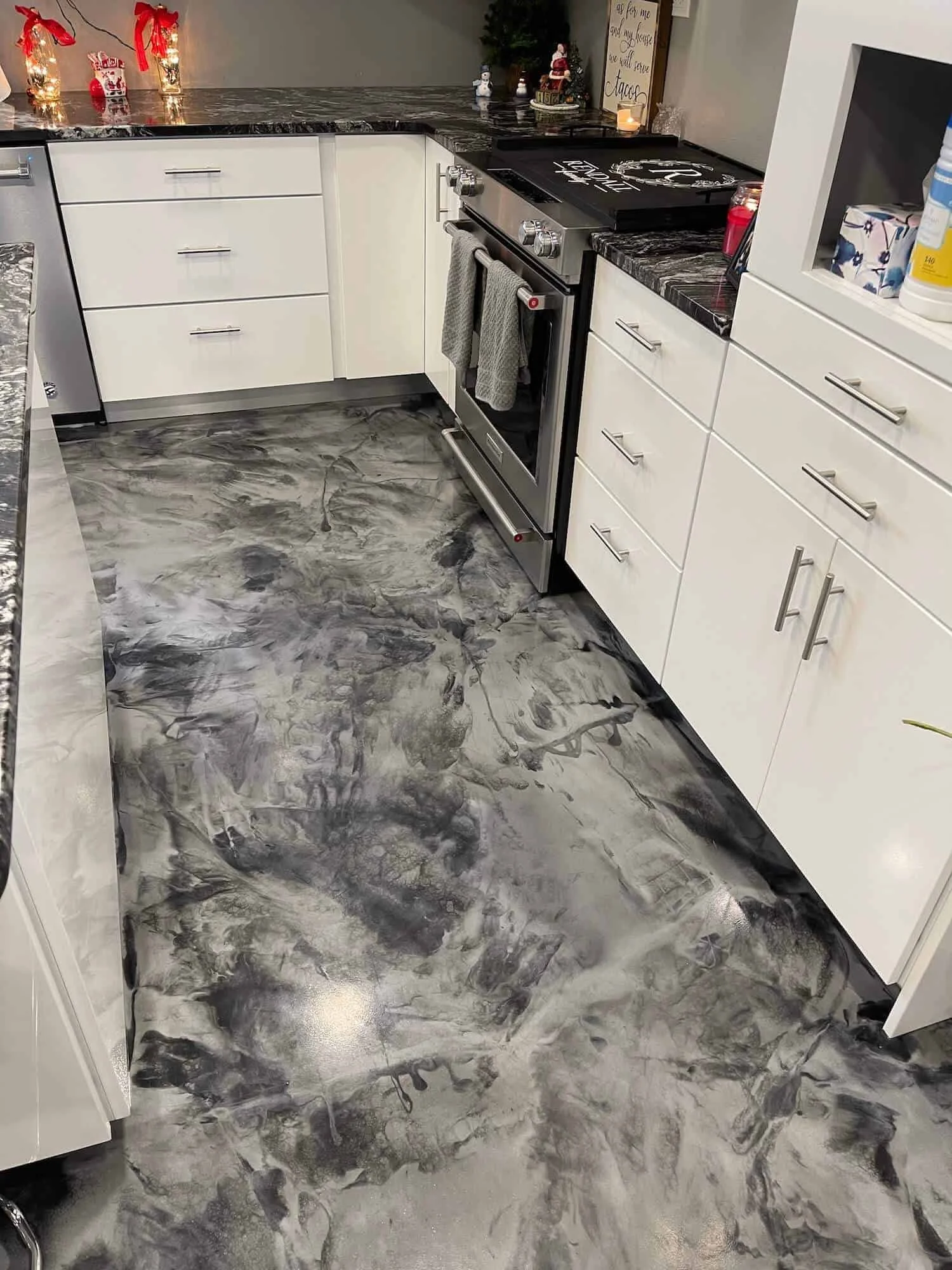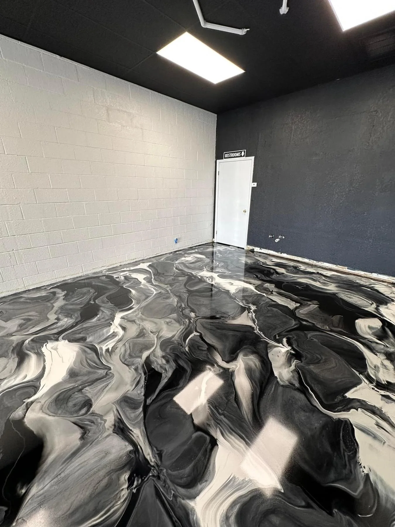 Metallic epoxy creates a mesmerizing, three-dimensional look with swirls and patterns that mimic natural stone, marble, or even a galaxy effect. No two floors are exactly alike, giving your space a one-of-a-kind finish.Durability: